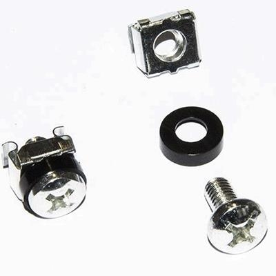 Set di 50 viti, rondelle di plastica e dadi a gabbia apposite per fissare i normali dispositivi 19" ai montanti laterali degli armadi rack.